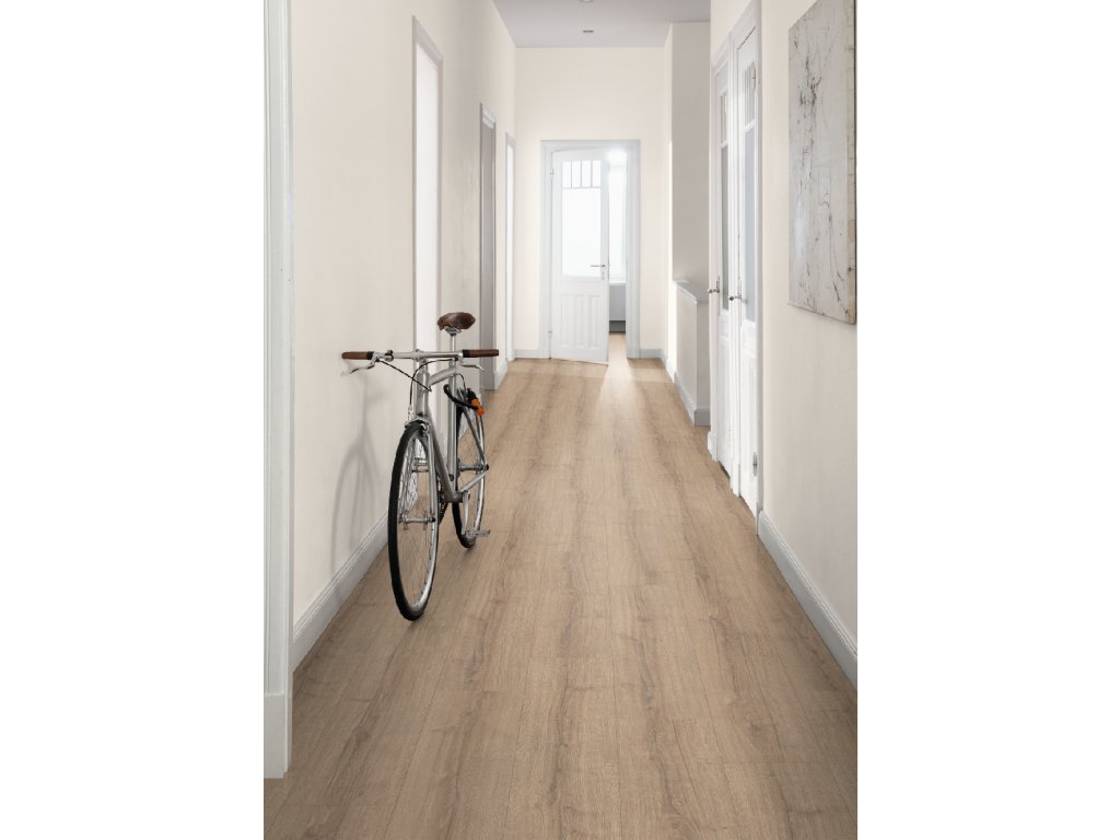 Laminátová podlaha NatureSense Aqua je skutočne všestranná a vďaka vodotesnému profilovému tesneniu sa dá použiť v kúpeľniach a kuchyniach.