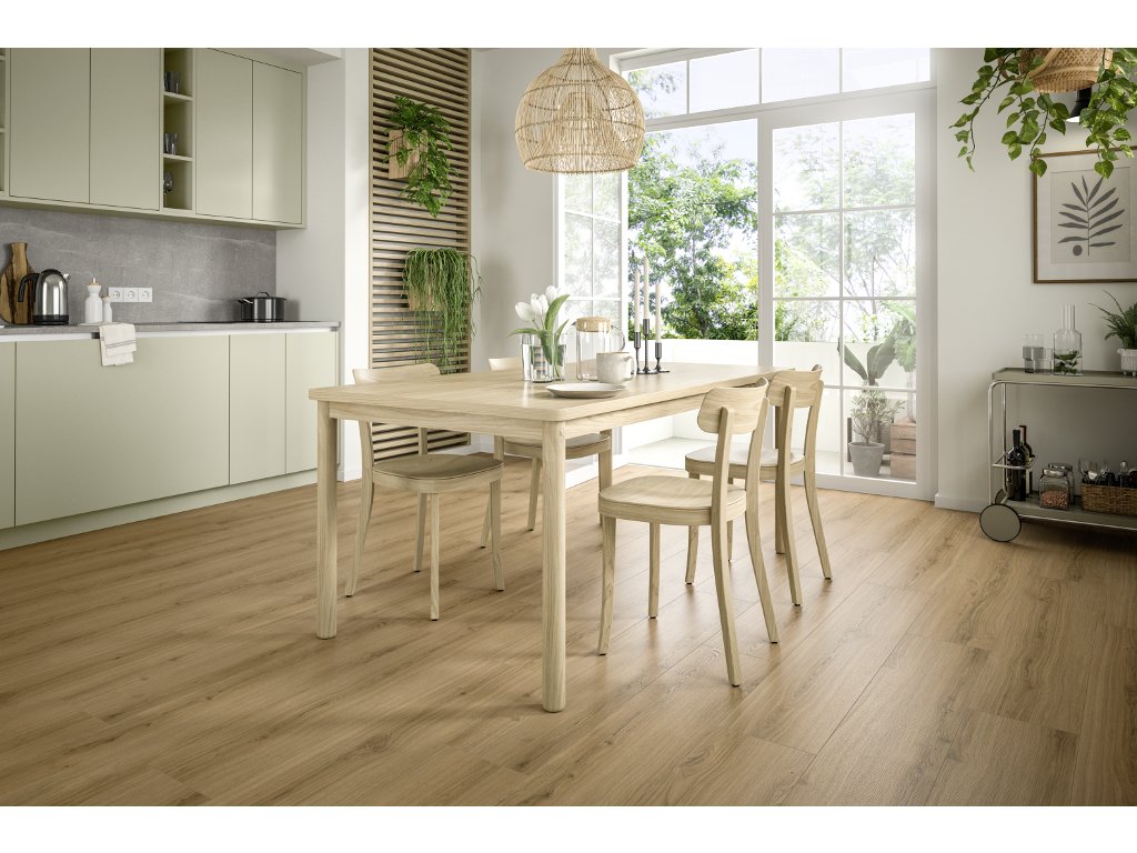 Laminátová podlaha NatureSense Aqua je skutočne všestranná a vďaka vodotesnému profilovému tesneniu sa dá použiť v kúpeľniach a kuchyniach.