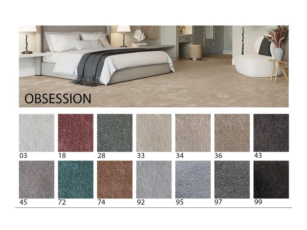 Belgický Metrážny koberec Obsession… vrcholná úroveň jemnosti Pokiaľ ide o rozmaznávanie, nič nie je priveľa. So svojím honosným povrchom je Obsession stelesnením zmyselnosti. Pripravte sa na to, že vás ohromí, keď sa ponoríte do novej dimenzie jemnosti. Ako ďaleko zájdete? Prežijete svoju posadnutosť diskrétne v jemných tónoch, alebo sa k nej naplno priznáte výberom sviežich farieb Obsession?