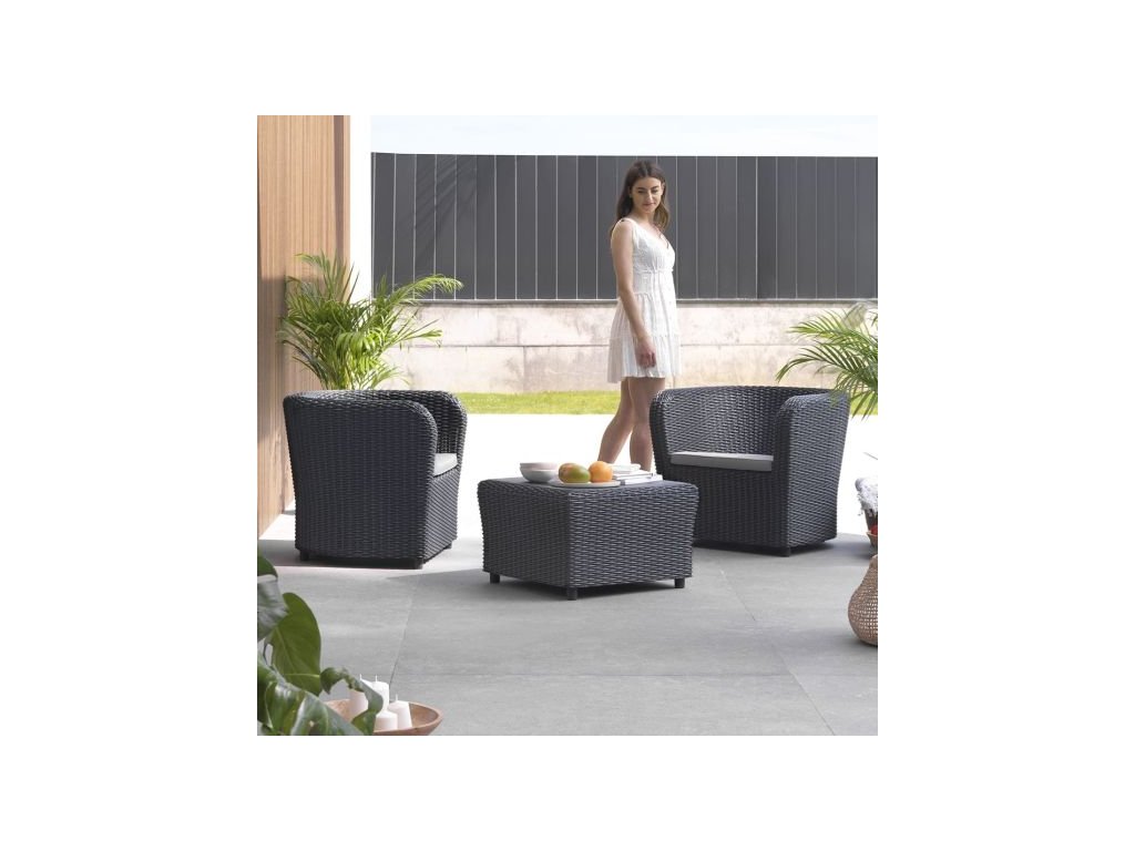 Záhradná zostava Nova dokáže premeniť akýkoľvek vonkajší priestor na oázu pohodlia a elegancie. Zaoblené línie navrhnuté Inmou Bermudez dodávajú tejto záhradnej zostave moderný a inovatívny vzhľad, ktorý imituje prírodný pletenec. Ideálne na použitie v interiéri, ako aj na akúkoľvek terasu, balkón alebo záhradu. Jedinečná štýlová kvalitná zostava Nova v antracitovej farbe je vyrobená z kvalitného materiálu umelého ratanu. Vyrobené z recyklovaného plastu odolného voči UV žiareniu, neobsahuje kovové časti, takže sa dá ľahko recyklovať. Spolu s kreslami je súčasťou zostavy stolík s úložným priestorom. Pohovka sa predáva samostatne. Poťah vankúša je možné vymeniť a prať na 30°.